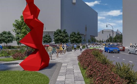 The redesigned corridor is lined with amenities like bike racks, benches, café seating, and sculpture pads to provide visually appealing areas of congregation within a largely linear site.