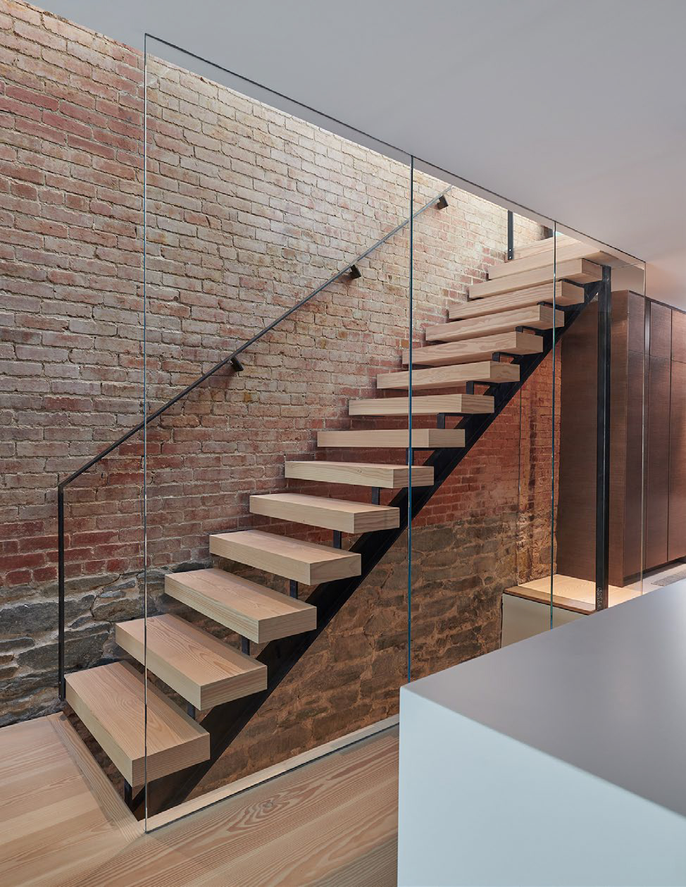 Robert M. Gurney, FAIA modernized and expanded this traditional Georgetown rowhouse. To do this, a rear addition was added with a new living room on the first floor and a master bedroom suite on the second floor. In the original house, spaces on the first floor are now a kitchen and dining room while the basement is now a family room. The new rear wall is almost entirely made of glass to connect the interior spaces with the rear yard. Inside, part of the original masonry, comprised of stone and brick, were left exposed. New features include Douglas fir floors, glass railings, and recessed lighting fixtures.